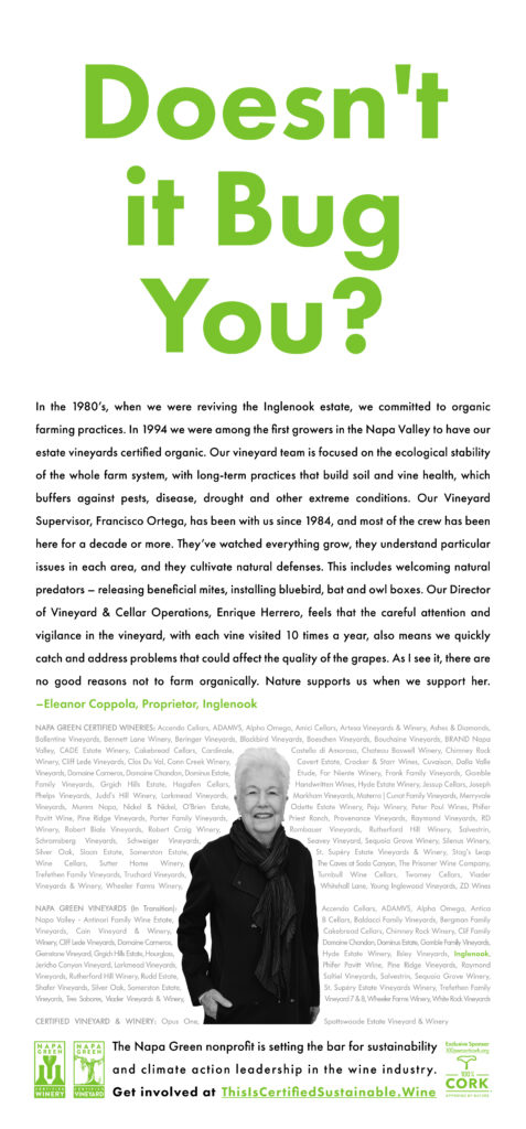 The good news is that grape growers utilize fewer pesticides* than many agricultural sectors. n 2023, Napa Green became the first sustainable winegrowing certification program globally (of which there are ~20) to require the phaseout of glyphosate and synthetic herbicides.
