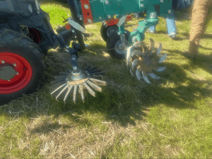 Vintner and vineyard manager/winemaker Ames Morrison of nearby Ames Medlock winery came to look for equipment compatible with his regenerative no-till vineyard. He said his current but aging weed implement raises a lot of dust and has parts that wear out fast. He’s looking for an implement with a whipper, which would be gentler than tilling.