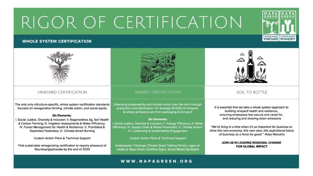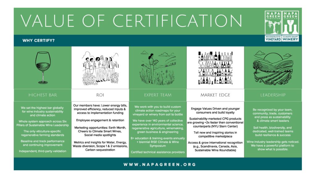 The sales of sustainability-marketed products are growing 2.3x faster than conventional counterparts according to the annual Sustainable Market Share Index, which reviews over 70,000 consumer-packaged good SKUs. Meaningful third-party certification is a chance to not only build more resilient vineyards and businesses, but also differentiate your wines and tell new stories.